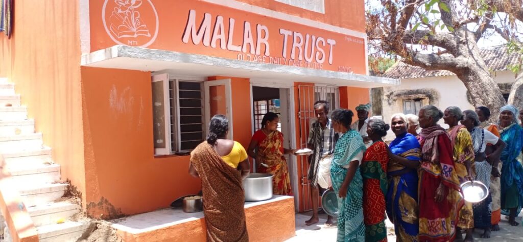 After Malar Trust made a donation of plastic sheets to cover the most damaged huts of the village, the Amoor Panchayat asked the Association to do something to help the elderly population on a regular basis and offered us a public building that was not in use.